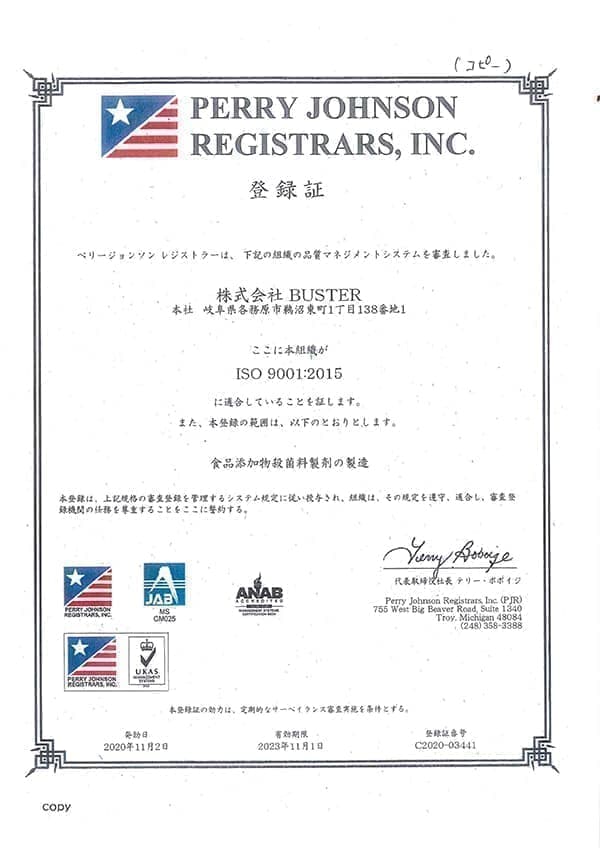 世界的なグローバル認証機関 アメリカ本社ペリージョンソレジストラーによる食品添加物殺菌料製剤の製造。